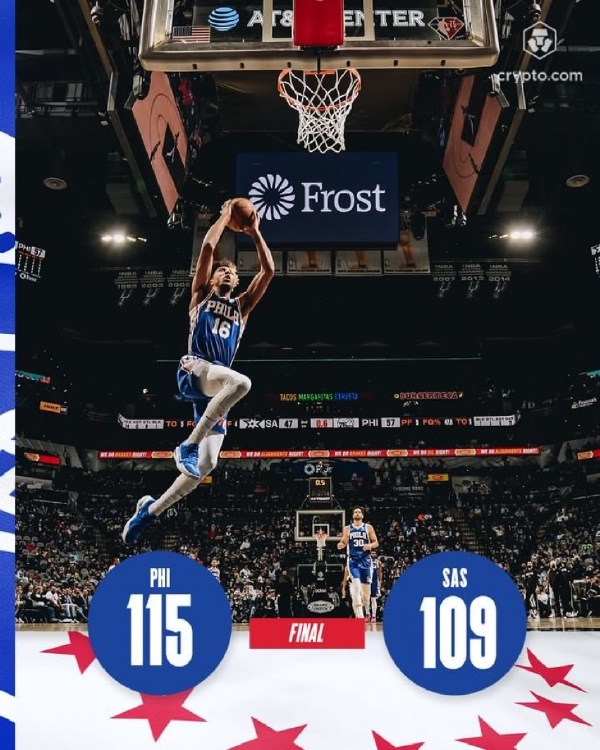 76人(27-19):恩比德38分12篮板6助攻、哈里斯18分11篮板5助攻、布朗7分4篮板2抢断、科克马兹17分4篮板3助攻、马克西18分4篮板6助攻、乔8分、德拉蒙德6分7篮板