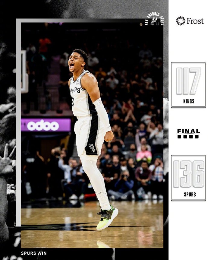 24直播网 11月11日讯 NBA常规赛,马刺主场迎战国王,首节马刺快速进入比赛状态,凯尔登、穆雷、瓦塞尔多点开花,在取得7-0开局之后他们又打出20-4的进攻狂潮彻底拉开比分,次节马刺乘胜追击一度领先22分,此时国王依靠福克斯等人的出色发挥打出一波10-1稍稍缩小分差,无奈沃克和穆雷末段再中三记三分,马刺在半场结束时取得了17分的优势。第三节福克斯连得8分率队用一波10-1迫近比分,但马刺很快三军用命重新掌控比赛局势,麦克德莫特、瓦塞尔、赛迪斯-杨们各个争先让国王是防不胜防,末节国王外线手感依旧冰凉,纵使福克斯连投连中也没能组织起有效的反击,马刺一路稳扎稳打收下比赛。最终,马刺136-117战胜国王。