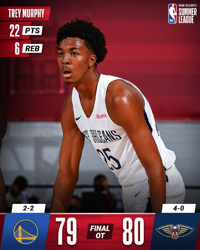 24直播网8月16日讯 NBA夏季联赛勇士对阵鹈鹕,开场后勇士首先进入状态,但墨菲发挥神勇带领鹈鹕一度反超比分,第二节勇士外线找到手感,但鹈鹕通过突破和反击也毫不示弱,两队上半场打成37平。下半场两队仍旧打得势均力敌,两队多次打成平手,马绍尔补篮点进将比赛拖入加时,加时赛中墨菲关键补篮绝杀,最终鹈鹕加时80-79险胜勇士。