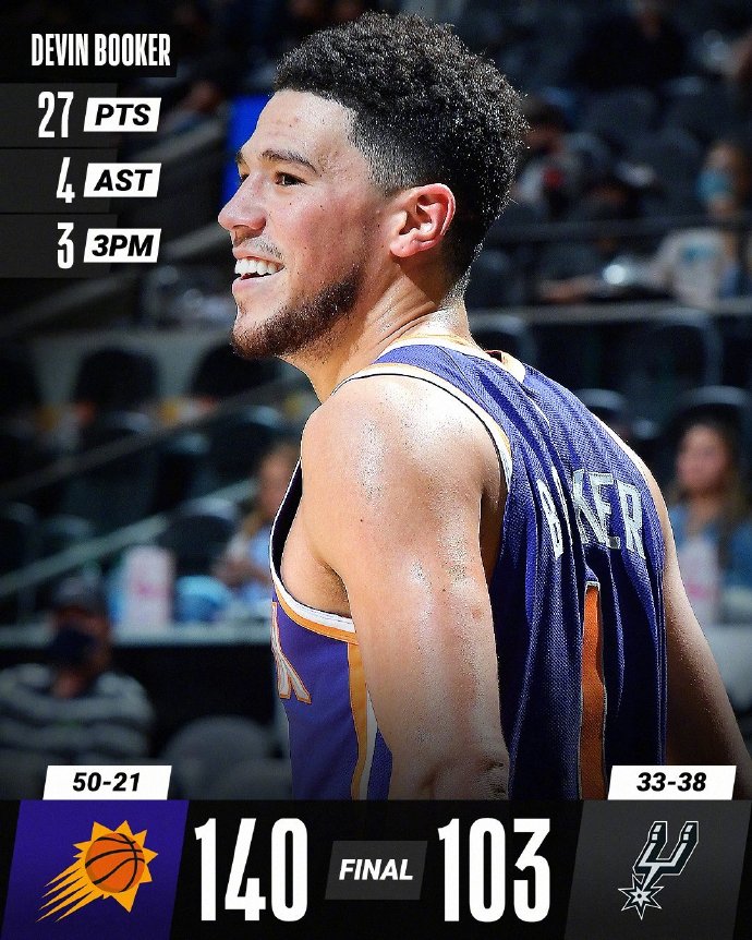太阳(50-21):保罗16分5板10助、布克27分2板4助、布里奇斯18分4板3断、萨里奇13分6板1助2断、克雷格11分9板2断、佩恩12分2板6助