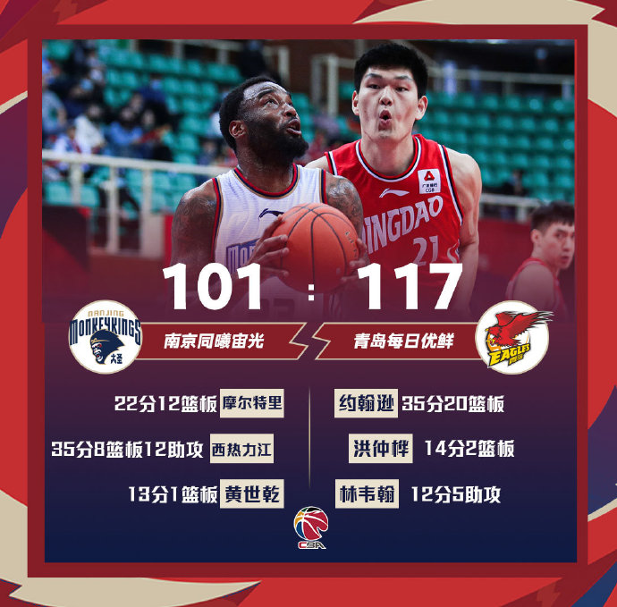 同曦(9-44):摩尔特里22分12篮板2助攻,西热力江35分8篮板12助攻,黄世乾13分,王旭7分4篮板,万圣伟6分4篮板,乔文瀚7分4篮板3助攻,王子麒5分2篮板。