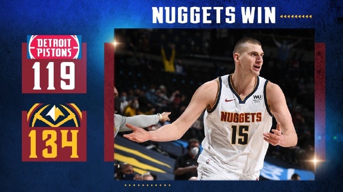 24直播网4月7日讯 NBA常规赛掘金主场对阵活塞,戈登加盟掘金后如鱼得水,掘金也是取得5连胜佳绩,开场后活塞首先进入状态取得领先,不过随着约基奇开始发力,他带领掘金追上并反超比分。第二节掘金延续进攻状态,他们多点开花将分差拉大到两位数,虽然活塞一度通过反击缩小分差,但约基奇又带领掘金掀起高潮在上半场结束时以76-56领先到20分。下半场虽然活塞多次通过外线三分追分,但掘金始终保持不错进攻状态,最终掘金134-119轻松击败活塞取得6连胜。
