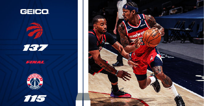 24直播网2月11日讯 NBA常规赛,奇才今日坐镇主场迎战猛龙,猛龙上场比赛第四节逆转战胜灰熊,奇才上场也险胜公牛,本场比赛威斯布鲁克回归。比赛开局阶段,猛龙全队三分手感火热连续投进,建立优势,奇才外线失准只能内线强打或找寻突破机会得分苦苦支撑,首节结束猛龙领先12分。第二节小洛佩兹成为奇兵,内线连续打成帮奇才追近比分,猛龙在西亚卡姆、洛瑞的带领下半场结束依然保持13分的领先优势。下半场,奇才追分势头迅猛,比尔、阿夫迪亚联手打出8-0小高潮,猛龙依靠三分手感依然保持双位数领先,末节纳斯关键挑战成功,鲍威尔屡屡建功,猛龙一波11-0杀死比赛,最终猛龙137-115轻取奇才,拿到连胜。