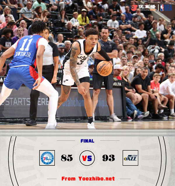 24直播网7月11日讯 NBA盐湖城夏季联赛,76人对阵爵士。一开场,双方势均力敌,比分始终紧咬,爵士内外开花,76人连投带罚打出8-0迅速回应,次节阿鲁玛三分吹响球队进攻的号角,76人持续发力扩大领先,爵士不断冲击篮筐努力追赶,康西尔飙中三分,半场战罢76人44-34领先10分。下半场,爵士大举反击,多点开花不断迫近比分,森萨博反击暴扣带队反超,末节双方争夺陷入白热化,比分交替领先,关键时刻爵士连投带罚确立优势,76人苦苦追赶无果。最终,爵士93-85力克76人。
