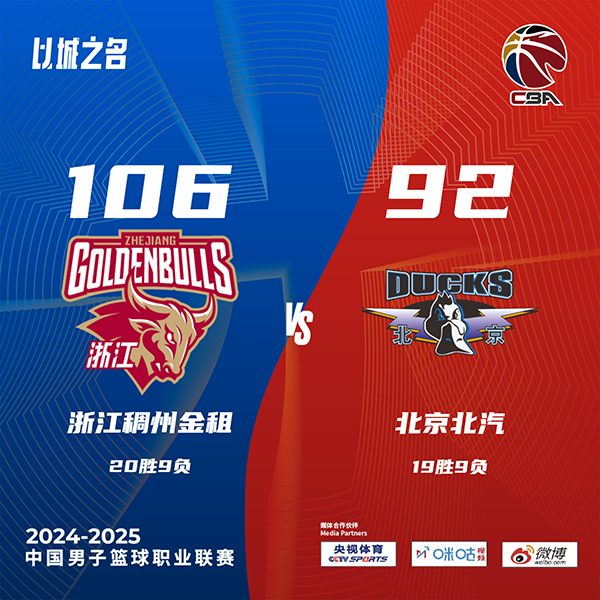 24直播网讯北京时间1月11日讯 CBA常规赛继续强强对话,浙江主场迎战北京,浙江上场大胜宁波,目前19胜9负暂列联赛第7位,北京不敌广厦后战绩更新为19胜8负,排在联赛第9位。此役周琦因发烧缺阵,曾凡博继续休战。首节开打后北京开局状态慢热,浙江双外援琼斯和约克轮番取分,杰曼联手所罗门苦苦支撑,但末段浙江开始发力拉开比分,首节结束时浙江领先9分,次节回来,两队外线手感冰凉,中段北京找到节奏回敬10-0小高潮一度追平,但浙江内外结合及时回应,半场战罢,浙江依然领先5分。易边再战后北京进攻再度陷入停滞,浙江延续火力不断打出小高潮,三节结束后浙江将优势扩大到13分,末节上来,北京率先换上替补阵容,浙江稳扎稳打牢牢占优,北京无法打出追分高潮翻盘无望,最终浙江卡位战106-92力克对手。