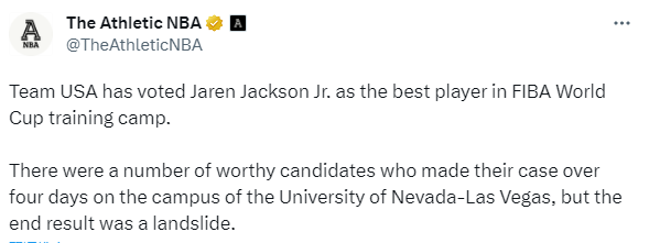 美国男篮训练营MVP投票结果出炉,小贾伦-杰克逊以压倒性的优势被评为在美国男篮训练营中表现最好的球员。