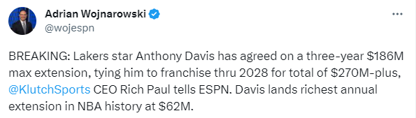 3年1.86亿!浓眉提前顶薪续约湖人 合同创纪录