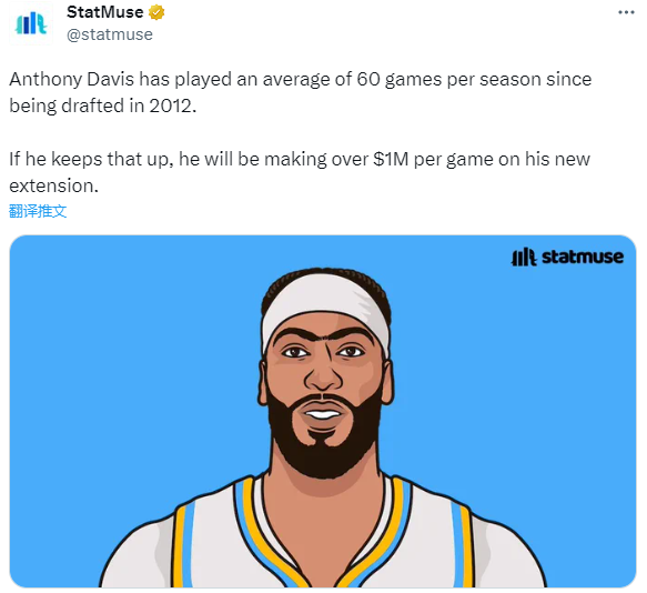 据美媒报道,自2012年进入联盟后,浓眉每赛季平均出战60场,若浓眉保持该出战频率,在他的新续约合同期间,他每场比赛的平均薪水超过100万美元。