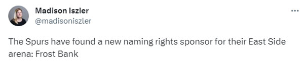 Madison Iszler撰文写道,再见了,AT&T中心 ,马刺已经找到了新的球馆冠名商——弗罗斯特银行;自从2006年以来,马刺球馆一直被称为AT&T中心,至今已经有17年的历史,期间马刺曾在2007年和2014年夺得总冠军。