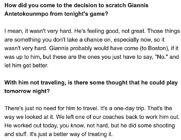 里弗斯透露字母哥的腿筋伤势无大碍,为了保险起见,球队让字母哥继续休战;据悉,字母哥没有随队来到波士顿。