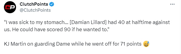 近日小肯扬-马丁参加了乔治的播客节目,谈到利拉德面对火箭狂砍71分,小马丁表示:一想到我就恶心想吐,他半场时就砍了40分。如果他想的话,他能得到90分,我真的这样想。如果我们不选择包夹他,他会得到90的。他在场上运球,我想要断掉,他都不借助掩护。