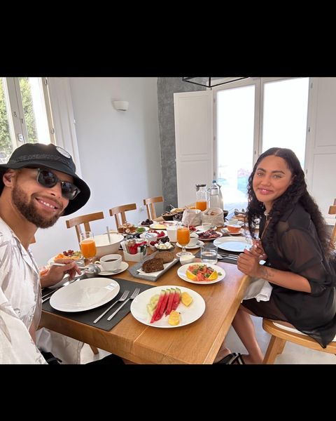 库里和阿耶莎正在希腊庆祝他们的结婚周年纪念日,库里夫妇乘坐游艇出海尽享二人世界,库里和阿耶莎躺在游艇上享受日光浴,两人合影库里赤膊亮相十分抢镜,阿耶莎搞怪吐舌,他们还一起享受美食。