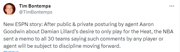 联盟最近与利拉德及其经纪人进行谈话,并会面多支利拉德经纪人警告过的球队,NBA联盟已经向30支球队发送了一份备忘录,表示:我们已经警告利拉德及其经纪人,若未来出现任何与球队私底下的沟通或公开言论谈及利拉德只想被交易到某支特定的球队,利拉德可能将遭到联盟的处罚。我们也告知球员工会,任何球员或经纪人作出的类似行为也可能遭到处罚。