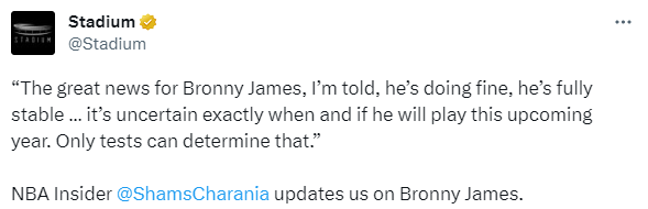 对于布朗尼的康复情况,名记shams透露好消息,shams在节目中表示:根据目前我被告知的情况,这对于布朗尼-詹姆斯来说是个很好的消息,他的情况不错,他的状态是完全稳定的。他的感觉很不错。此次心脏骤停事件发生在周一,他在走下球场的时候晕倒了。布朗尼很幸运,他被迅速复苏,及时处置,有南加州大学的医护人员在场。根据我被告知的情况,他已经接受了一些检查,在接下来几天内还有更多的检查,来确定此次事件发生的具体原因。
