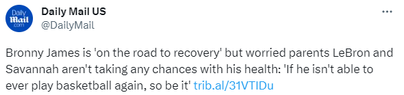 近日布朗尼在南加州大学进行训练时遭遇心脏骤停的意外,倒地后失去意识,接受紧急治疗后被火速送到医院,所幸布朗尼很快就脱离危险并且离开重症监护室,詹姆斯第一时间前往医院陪伴自己的孩子,布朗尼恢复顺利,这让詹姆斯夫妇如释重负。