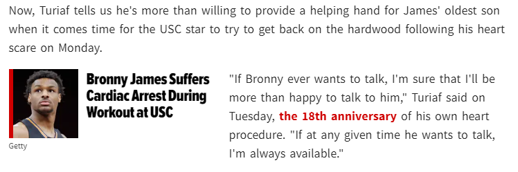近日前NBA球员罗尼-图里亚夫接受采访时,他表示愿意为布朗尼提供任何关于心脏问题恢复的必要帮助。