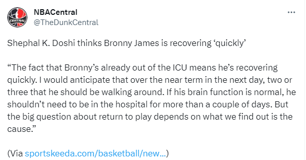 医学专家Shephal K. Doshi则表示:布朗尼已经离开了重症监护室,这意味着他恢复得很快。我预计在接下来的两三天内,他应该就可以走动了。如果他的大脑功能正常,他应该住院不用超过几天。但至于他能否重返赛场,最终还是要取决于我们找到他心脏骤停的原因是什么。