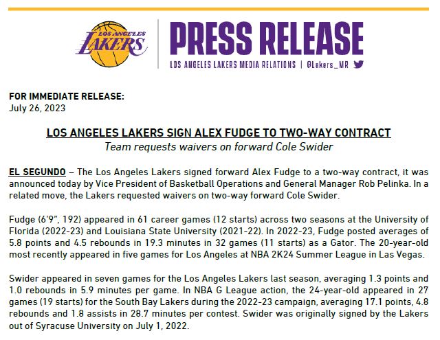 湖人官宣裁掉科尔-斯威德,并且用双向合同签下亚历克斯-福奇,佩林卡正式宣布此事,湖人官方欢迎富奇加盟。