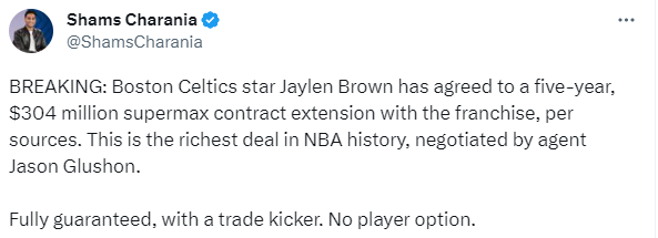 此前哈利伯顿、贝恩、三球和小萨博尼斯都提前续签了5年超过2年亿美元的大合同,如今布朗签下历史最大合同,总额超过3亿美元。这份合同是全额保障的,并且含有交易保证金,没有球员选项。