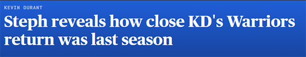 库里还透露,当勇士管理层和谈论关于再次追求杜兰特的话题时,他对任何关于杜兰特的交易都支持;库里表示:如果你说,‘哦,KD回来了,我们要和他一起打球’,那三年我和他一起玩得很开心,我会说,“我愿意”!