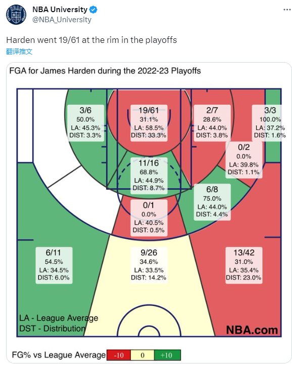 在22-23赛季季后赛,哈登的整体表现很不好,美媒晒出哈登上赛季季后赛的投篮热图,并写道:哈登的季后赛篮下投篮表现为61投19中(命中率仅为31.1%,低于联盟平均水准),这也是76人今夏不愿给哈登4年2.1亿美元顶薪合同的原因之一。