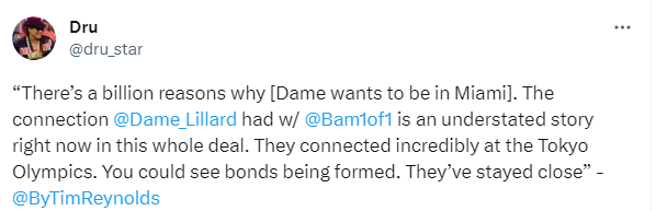 “利拉德已经下定决心了,去热火就是他想要的,我相信他做出这个决定有数以亿计个原因,但我认为他和阿德巴约之间的关系在整个过程中被低估了,他们在东京奥运会上建立了不可思议的联系,你可以看到他们之间一直都很亲密。”