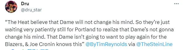 热火记者Tim Reynolds在播客节目中表示:热火相信利拉德不会改变主意,所以他们现在只是在等待开拓者意识到这一点(利拉德不会改变主意)。利拉德不想再为开拓者效力,乔-克罗宁(开拓者总经理)也知道这一点。