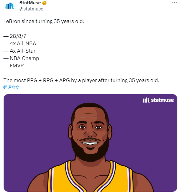 美媒Statmuse晒出詹姆斯35岁之后的数据和荣誉:场均28+7+7、4次入选最佳阵容、4次入选全明星、1次总冠军、当选FMVP,场均得分、篮板和助攻都是历史上35岁之后球员中最多的!