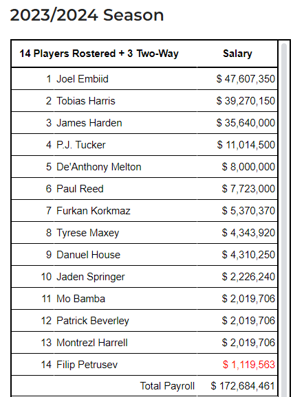 14位保障合同球员——恩比德、哈里斯、哈登、PJ-塔克、梅尔顿、科尔克马兹、马克西、豪斯、杰登·斯普林格、班巴、贝弗利和哈雷尔、保罗-里德、菲利普·彼得鲁舍夫;14人年薪加起来高达1.73亿美元,其中恩比德年薪4760万美元,哈里斯3927万美元和哈登3560万美元。