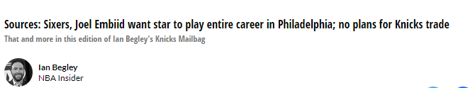 此外,76人绝对没有将恩比德交易去到尼克斯或者是任何其他地方的计划。