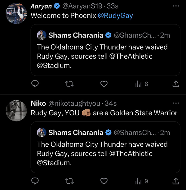 盖伊被裁后太阳球迷招募他加盟太阳,勇士球迷也招募他;据此前报道,勇士有意等待一些球队裁掉他们的老将,然后追求这些老将,其中就有盖伊的名字。