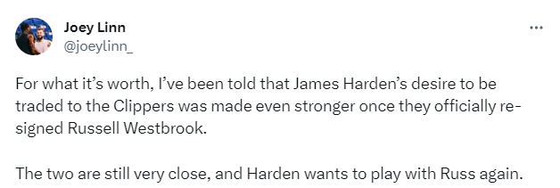快船记者Joey Linn报道, 我被告知,在快船队正式续约拉塞尔-威斯布鲁克后,哈登想要被交易到快船队的愿望变得更加强烈。 两人的关系仍然很亲密,哈登想再次和威少一起打球。