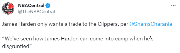 名记重申哈登一心只想加盟快船,而且哈登与76人管理层之间的关系已经破裂,双方彻底决裂;若在训练营之前没有被76人交易,哈登将将会十分不满;哈登已经下定了离队的决心,即使恩比德和贝弗利曾公开喊话希望他留下来,哈登仍坚持要走。