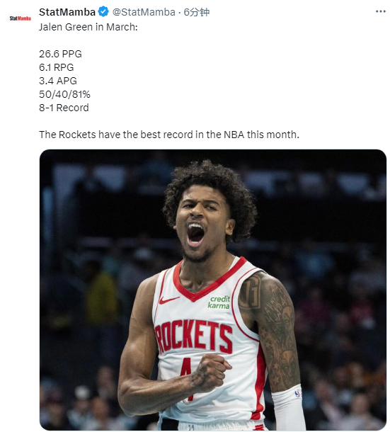 3月份至今,杰伦-格林场均拿到26.6分6.1篮板3.4助攻,带领火箭9战8胜1负,火箭成为本赛季在3月战绩最好的球队;赛后谈到自己的动力来源,格林言简意赅,直言:我的家人,我的孩子。