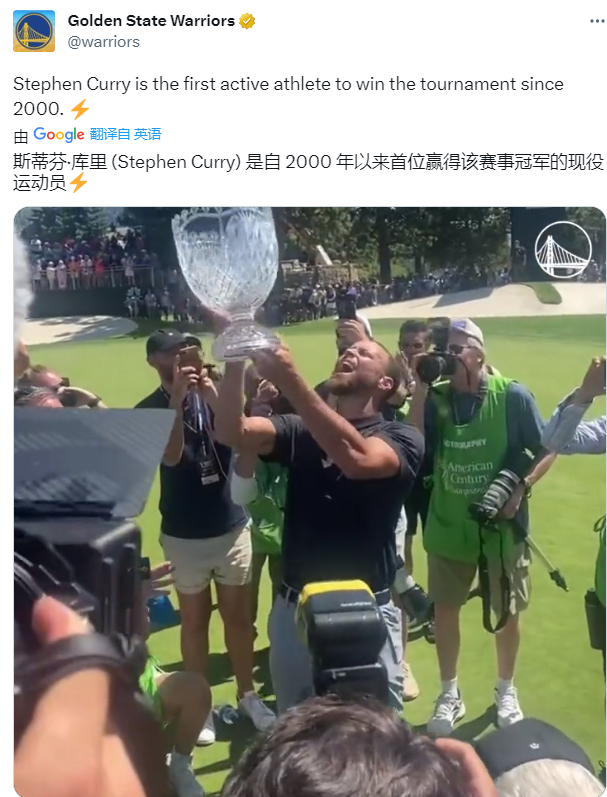 在美国高尔夫世纪锦标赛上,随着库里推杆进洞完成老鹰球,他正式夺得该赛事2023年的冠军,也是第34届该赛事的冠军;库里夺冠后把帽子扔向天空,一路奔袭、双手握拳怒吼庆祝,拥抱爱妻阿耶莎,后者顺势抬起双脚,直接趴在库里的怀中;现场观众也为库里欢呼。