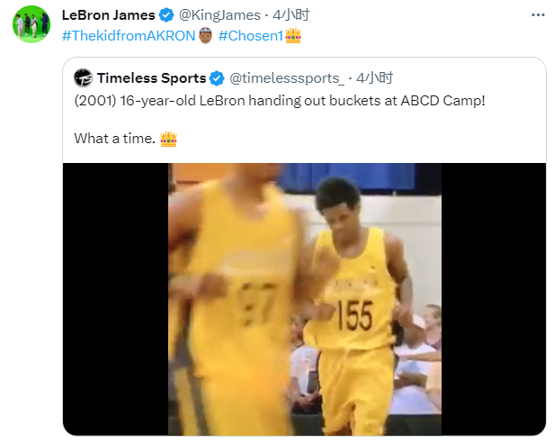 值得一提的是,詹姆斯今天还转发自己16岁训练营视频,配文写道:来自阿克伦的孩子,天选之子。