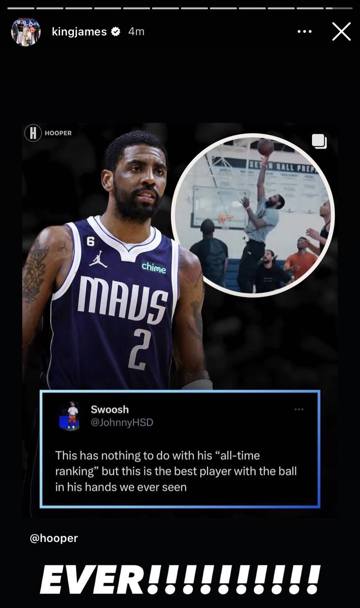 詹姆斯转发了一条展示欧文控球技术的视频,该条动态上写道:这与他的历史排名没有关系,但他就是我们见过的人球结合最好的球员。