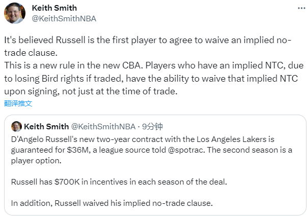 Keith Smith还表示据报道拉塞尔是第一个在续约时同意放弃隐藏的交易否决权的球员,这是NBA新劳资协议中的一条规则。