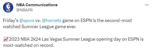 据NBA官方统计,在上周六马刺和黄蜂的比赛中,文班亚马迎来夏联首秀,本场比赛的收视率创赌城夏联历史第二高,这也是赌城夏联史上收视率最高的揭幕日。