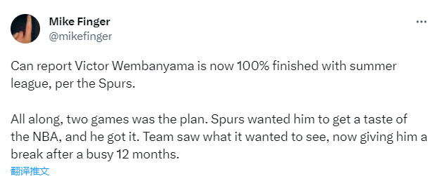 Mike Finger还表示,一直以来,马刺的计划都是让文班亚马出战两场比赛,马刺希望文班亚马能感受一下打NBA的滋味。马刺看到了他们所想看到的,在忙碌了一年之后,马刺将给文班亚马一点休息的时间;考虑到大局,马刺队和文班亚马都认为没有必要再打夏季联赛了,现在文班可以远离聚光灯了。