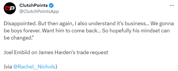 对于哈登申请离队一事,恩比德表示:很失望,但话又说回来,我也明白一切都是生意,我们会是永远的兄弟,我肯定希望他能回归,可以一起完成夺冠的目标,所以希望他的想法能够改变。但不管怎么说,我都很开心能和他成为朋友,自从他来了之后,我们都在成长。