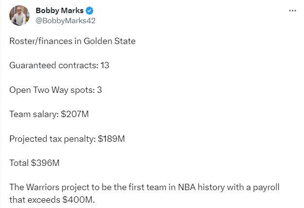 NBA薪资专家Bobby Marks表示,在签下达里奥-沙里奇后,勇士目前已经有13份保障合同,勇士全队总薪资已经累计达到2.07亿美元,预计要缴纳的奢侈税高达1.89亿美元,新赛季总开支高达3.96亿美元;若勇士继续补充阵容,他们预计将成为历史上首支单赛季支出4亿美元的球队。
