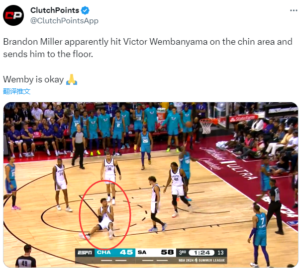 第一节最后1分多钟,2米24的文班亚马展现不俗的运球能力,如此身高仍能变向过人;文班亚马的威胁很大,持球背打米勒,瞬间吸引黄蜂多名球员包夹,不过文班亚马没顶动米勒,最终出现失误。