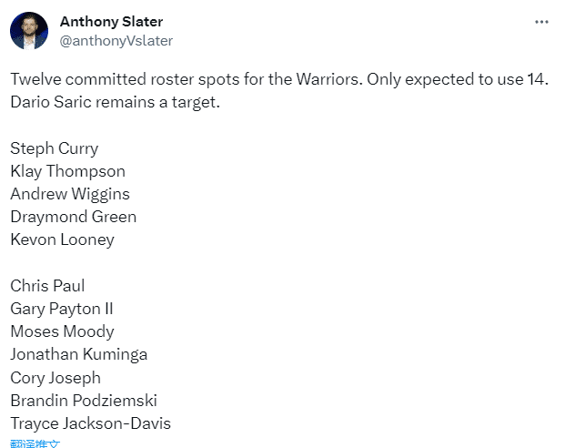 12人名单中有7名后卫,锋线和中锋只有5个,预计勇士将以14人名单开启新赛季,下一个目标是萨里奇。