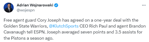 来源:24直播网07-03 10:3624直播网讯07月03日,在NBA自由球员交易市场上,勇士终于引援一名球员,据名记woj报道,知名经纪人里奇-保罗确认,科里-约瑟夫一年合同加盟勇士,新赛季约瑟夫辅佐库里冲击总冠军。