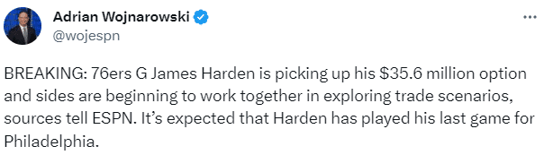 重磅!哈登执行3560万选项并探索交易 名记:他已打完76人生涯最后一战