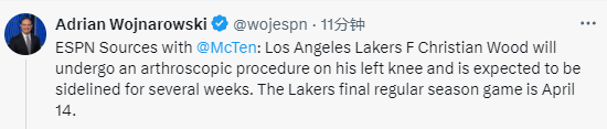 今日对阵老鹰赛前,湖人主帅哈姆表示很快就会有伍德伤情的最新消息,不过他没有说明后者的膝伤是不是有好转;如今名记报道,伍德将接受左膝关节镜手术,预计缺阵数周,恐怕会赛季报销。