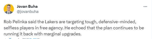 对于湖人队的这个休赛期,Mark Medina表示:就像詹姆斯在湖人队的这四年一样,他希望管理层在这个休赛期优先考虑赢在当下,补强去保持争冠的机会;据一位熟悉他想法的人说,和一些时候不同的是,詹姆斯不打算介入任何具体的自由球员签约或交易,不会介入管理层的决策,无论最终发生了什么,他都会给予支持。