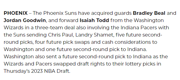 奇才得到:保罗、沙梅特、5个次轮(来自太阳的2024、2025、2026、2027和2030年次轮签)、4个首轮互换权(来自太阳的2024、2026、2028、2030年首轮互换)、部分现金(350万美元)、7号签(来自步行者,选中库利巴利)