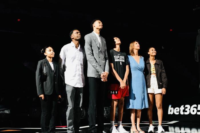 文班亚马晒出与马刺四大名宿的合影,照片中有邓肯、吉诺比利、大卫-罗宾逊和肖恩-埃利奥特,马刺四大名宿的球衣都早已被退役,他们都曾带领马刺夺得总冠军,其中邓肯曾5次带队夺冠。